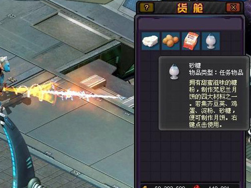 在你急切的要求下,兰特斯把你引到露娜丝身边,这位善良的姑娘送给你的是甜蜜的砂糖。此刻你货舱中已装着制作月饼需要的四种材料,只需轻轻一点就能收获梵尼兰月饼啦。