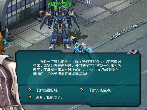 在知识大赛举办的时间,即星期一、星期五19:00―20:00,找到卡莱尔上尉来挑战知识大赛吧,用你的渊博学识让战友们叹服!