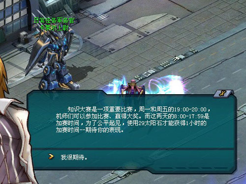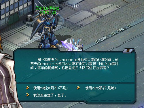当然如果你想有更多挑战知识大赛的机会,那么星期一、星期五8:00―18:00可以参加加赛――不过为了保证公平,参加加赛的机师们必须付出29太阳石才能获得1小时的加赛时间。
