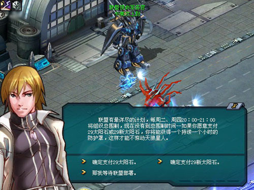 为了不惊扰天狼星人,联盟希望机师们在规定时段总攻月面。但杀死天狼星人缴获的战利品又着实诱人,你希望有更多的时间为联盟效力、获得珍贵物资,那么这时就需要购买一个1小时的防护罩,在8:00―18:00,有它的保护你就能不惊动天狼星人高层潜入月面,防护罩效用为1个小时!