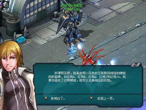 所谓同花顺,就是由同一花色的五张数码相连的牌组成的套牌,如红桃A、红桃K、红桃Q、红桃J和红桃10,收集到这种牌组可以向卡莱尔上尉兑换紫星打折券、+5乔氏粒子打折券、蓝星打折券等奖励。