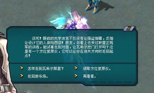 第一间休息仓是需要通过一座光学迷宫。进入后,程序员・戈兰会告诉你,地面上发光的箭头是一个个弹射点,根据箭头方向选择弹射点,便可以走到出口瓦希尔那里。戈兰还送给你一只方位复原仪,当你在迷宫中失去方向时,使用它可以返回起点。