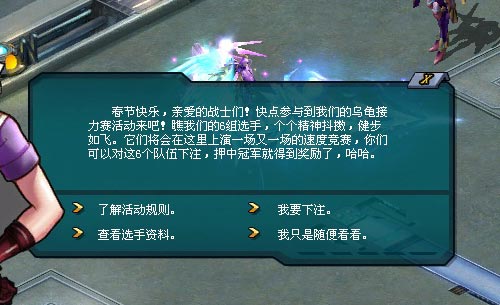 刚入场,便被告知活动即将开始了,看上去来得正是时候!迅速找到乌龟接力赛导游・雪凝了解一下具体情况吧!